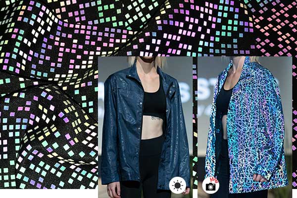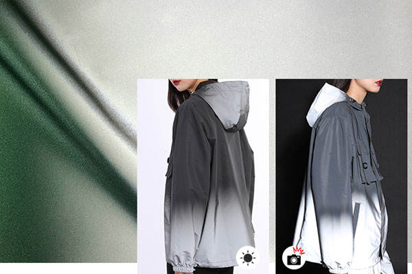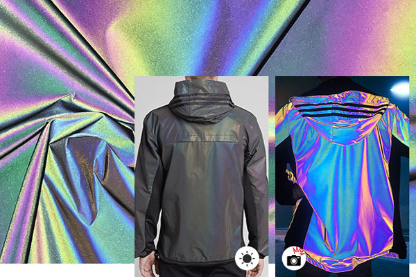 而隨著工藝技術的不斷創新,星華反光布的反光效果已不再是最初單一的銀灰色反光形式,七彩反光、印花反光、漸變雙色反光、彩色反光、夜光反光等多種新型反光布料應運而生。這些五彩繽紛的面料更加適合于在日常服飾、箱包、鞋帽設計上使用。無論是作為服裝的大身面料,還是作為鞋帽的包邊,或者是室內的背景布,反光面料都能讓原本平淡的設計增添更多的色彩變幻,打破常規,與眾不同。